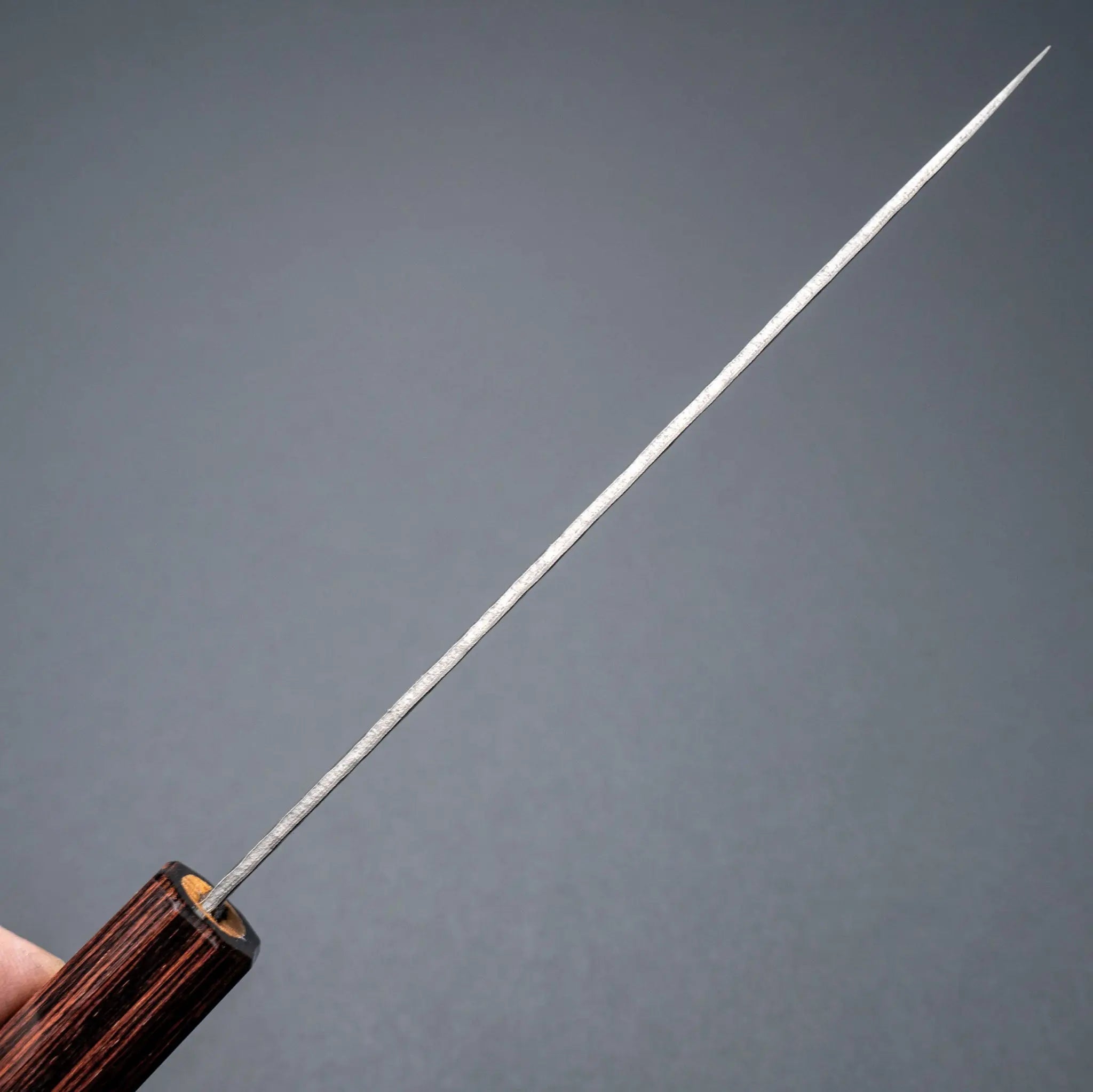 The knife has a core of white 1 (Shirogami 1) carbon steel which can keep an imported sharp egg for a very long time. Around the hard core steel, there is a layer of stainless steel on each side.
